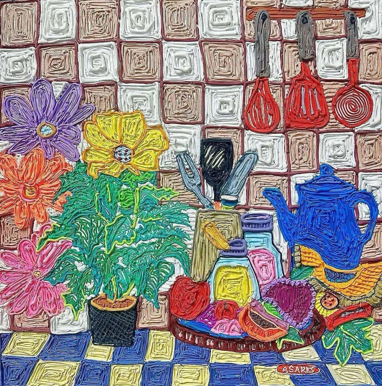 NICOLE ASARES (b. 1995, Bohol Philippines) is a visual artist known for her relentless use of textured line. Her work embodies the art of zen-doodles, creating playful and expressive images through patterns of dots, lines, simple curves, and spheres. She draws inspiration from everyday events and the stories of diverse people, enjoying the way they convey humor and playfulness. Her paintings are characterized by bold, graphic lines that seem to leap from the canvas, creating a sense of movement and dynamism.
